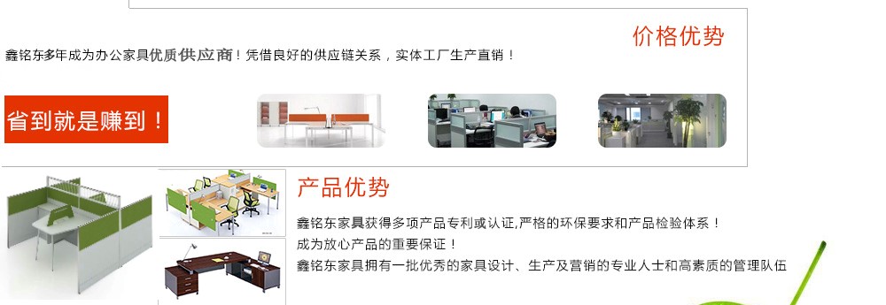 深圳市鑫銘東家具有限公司專業(yè)銷售各類辦公家具!產(chǎn)品涉及多種系列,如:班臺、班椅、屏風、會議桌、會議椅、辦公沙發(fā)、茶幾、辦公桌、文件柜、電腦桌椅、各式餐臺、餐椅、書柜等辦公家具。 鑫銘東家具擁有一批優(yōu)秀的家具設計、生產(chǎn)及營銷的專業(yè)人士和高素質(zhì)的管理隊伍。銘東家具以"先難后易"之戰(zhàn)略,在產(chǎn)品結(jié)構(gòu)、產(chǎn)品質(zhì)量及服務水平方面,均推陳出新,力求完善,精益求精。使我們的產(chǎn)品質(zhì)量保持在國內(nèi)外家具潮流的先進水平,力求滿足客戶的特殊需求。鑫銘東家具多年來致力于環(huán)保、實用家具的設計與開發(fā),集生產(chǎn)、銷售、服務于一體。本著"以人為本"的設計理念,大量開發(fā)符合人體工程學的各種產(chǎn)品,以"誠信為本"的質(zhì)量方針,真材實料,認認真真做產(chǎn)品,實實在在做人。鑫銘東家具更致力于創(chuàng)造"零維修率"的制造境界,實現(xiàn)"沒有維修的服務才是最好服務"的口號》了解更多
